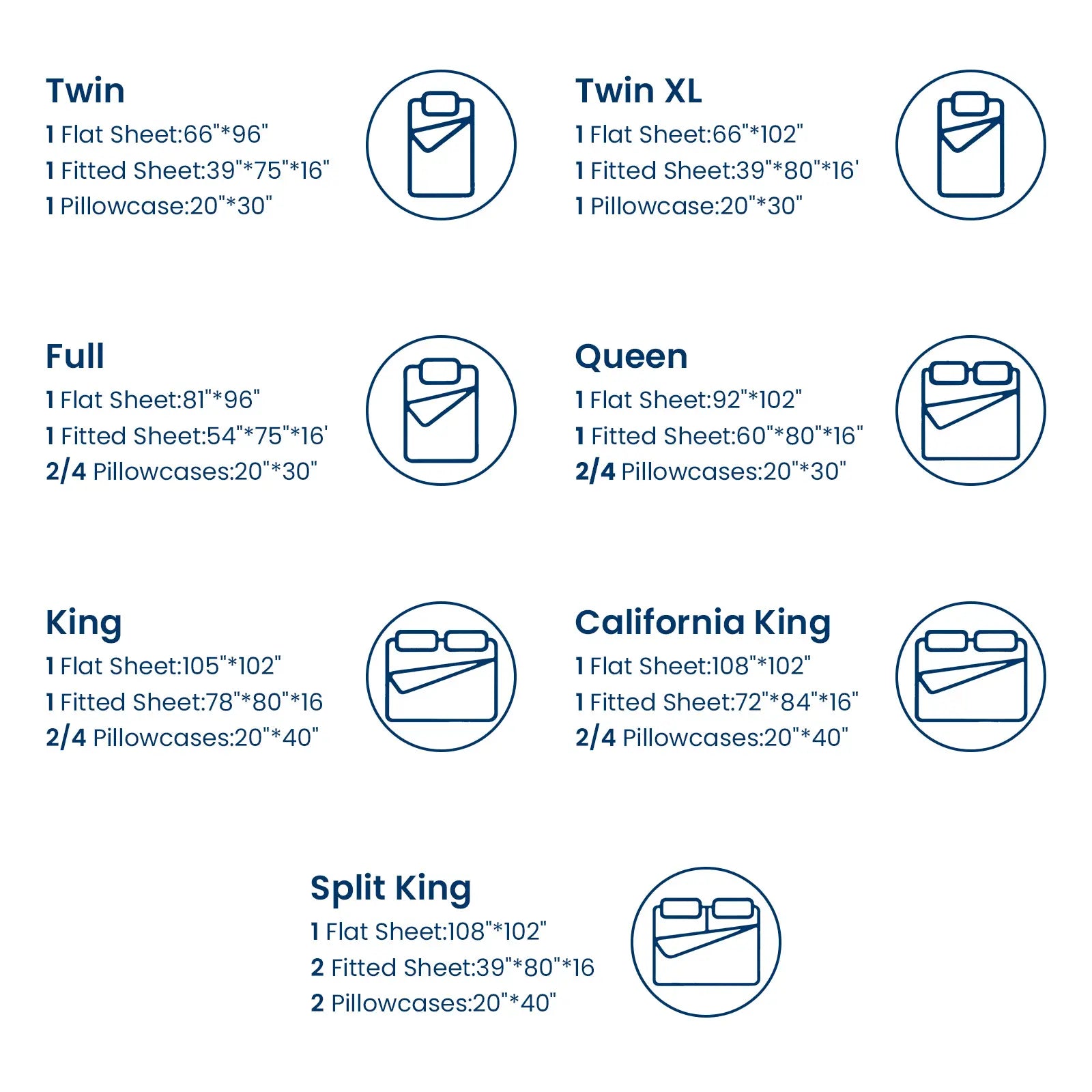 ·Queen: 6 pc sets include 1 flat sheet, 1 fitted sheet, 4 pillowcases.
